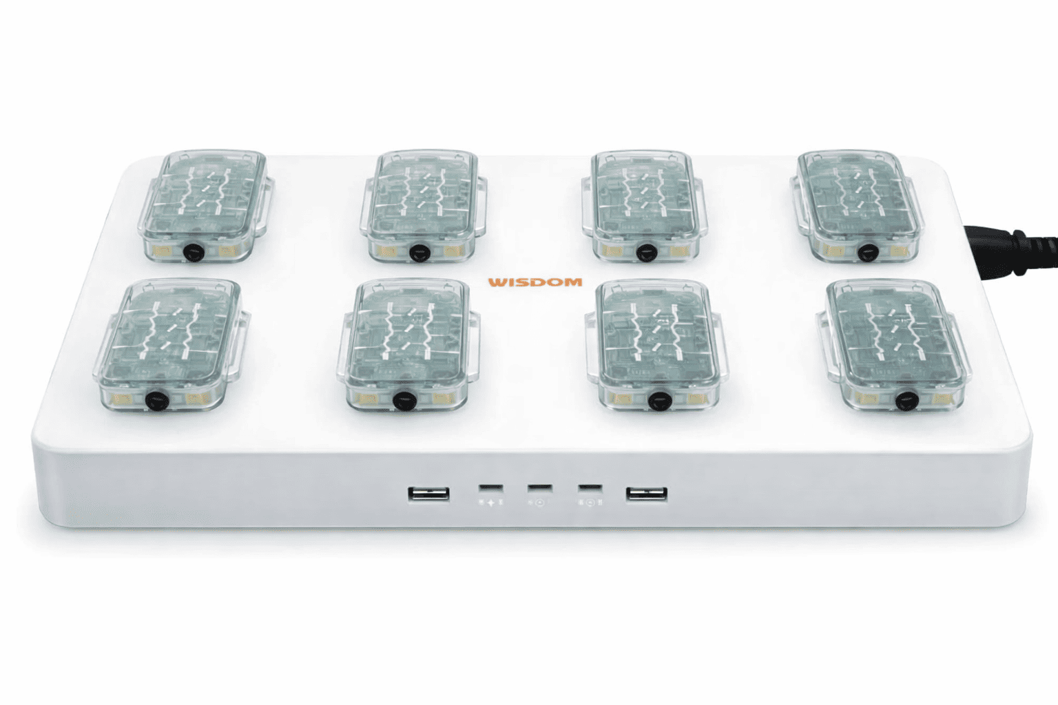 A compact desktop charging rack for safety strobes and industrial headlamps, designed for efficient charging, status visibility, and daily operational convenience.